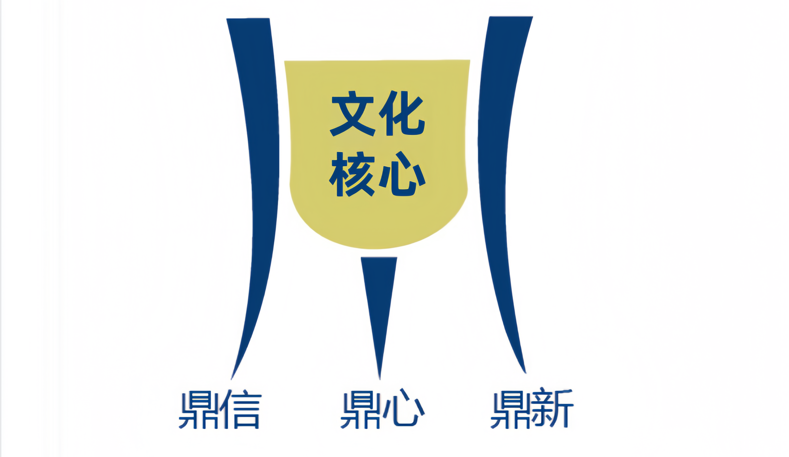 以“鼎”作为文化取材的主元素,鼎之三足,寓意权力、财富和名誉,映射到现代企业,即为影响力、经济力和公信力;三者各司其职,互相制衡,只有三者达到均衡,事业才会持久。